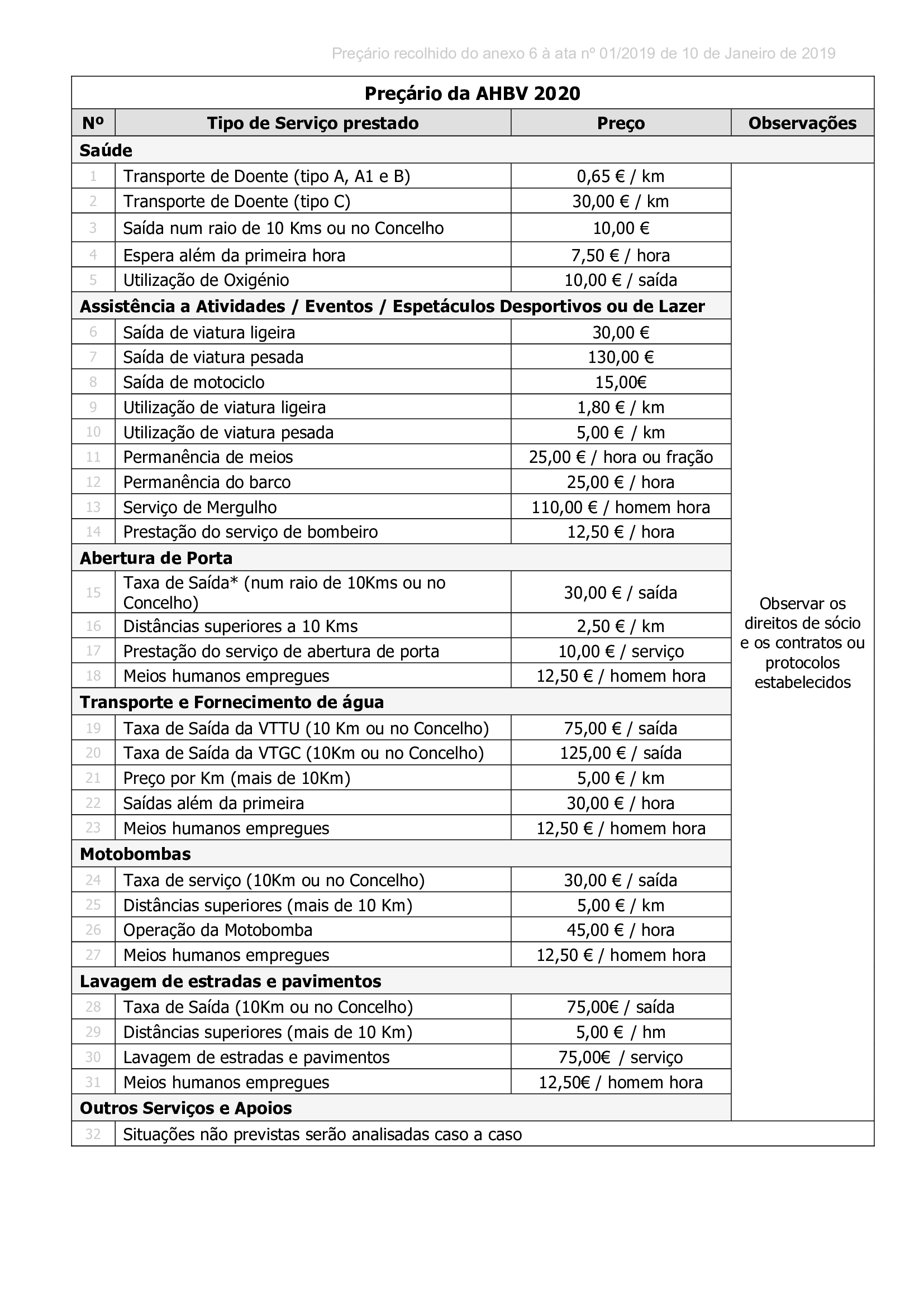 Os valores pagos pelos serviços prestados não haviam sido actualizados desde 2003 (15 anos). O presente preçário foi aprovado em 10 de Janeiro de 2019 (acta nº 01/2019, de 10 de Janeiro), passando a vigorar a partir da mesma data.